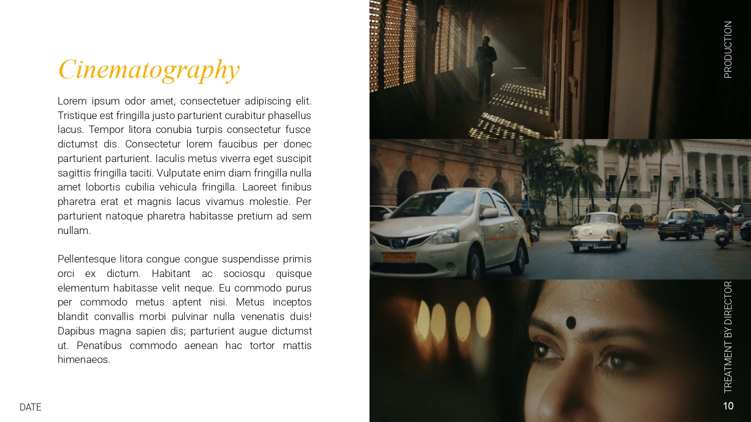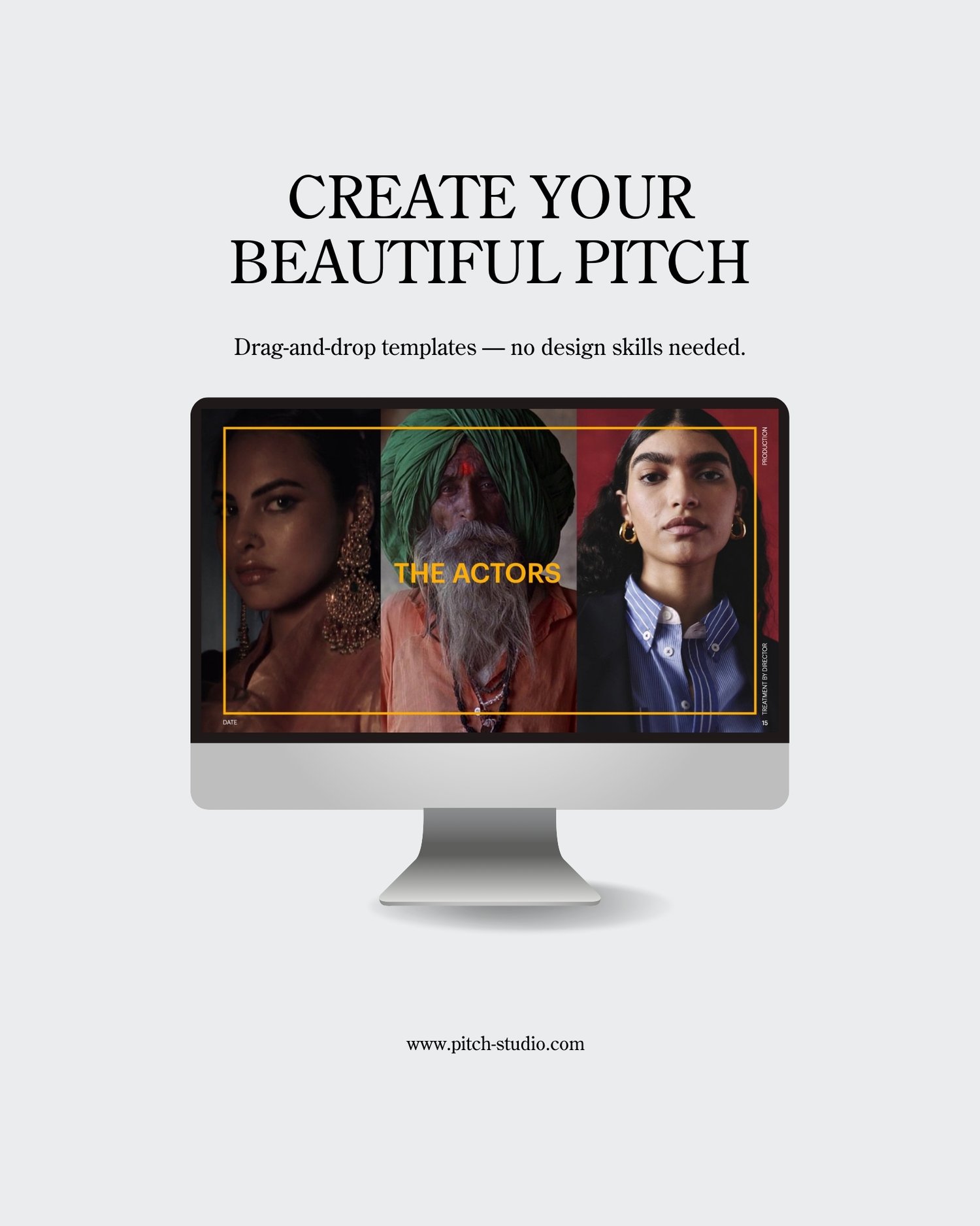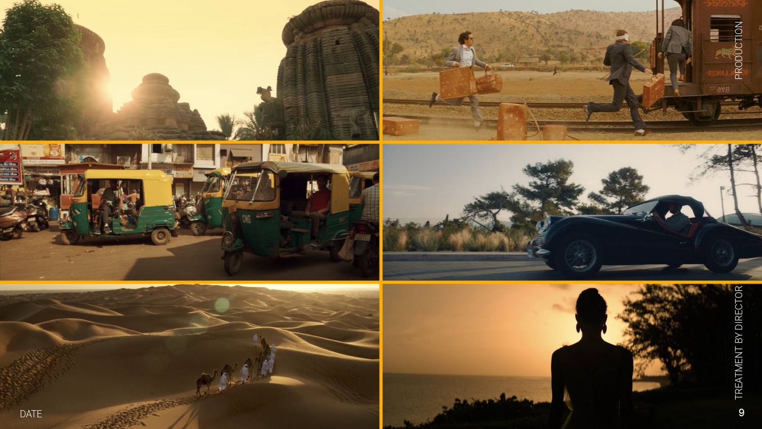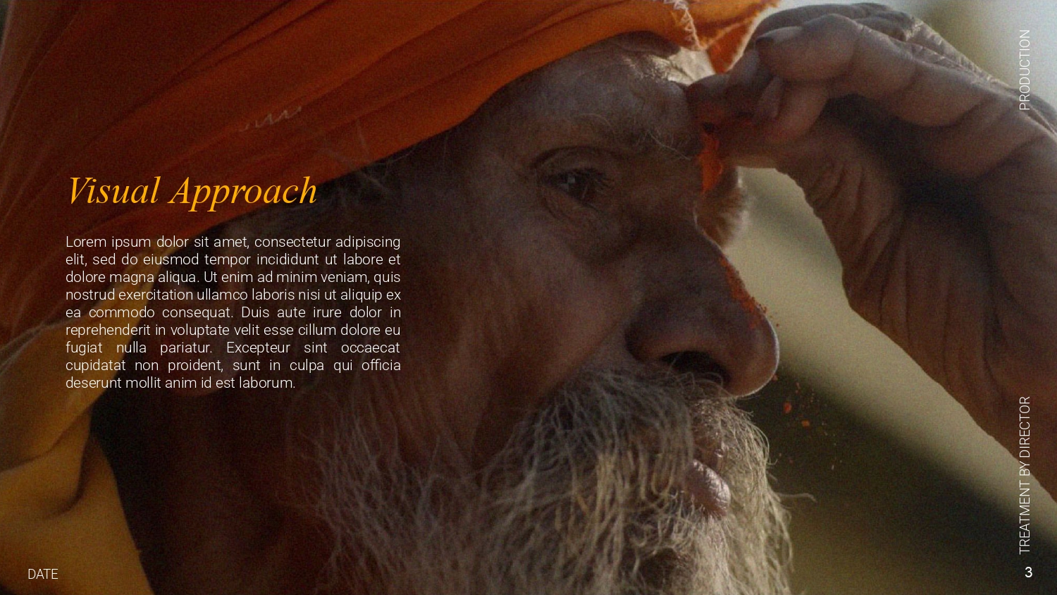This Keynote + Google Slides template (with GIF support in Google Slides version) is designed for directors pitching commercials with an Indian or South Asian aesthetic.