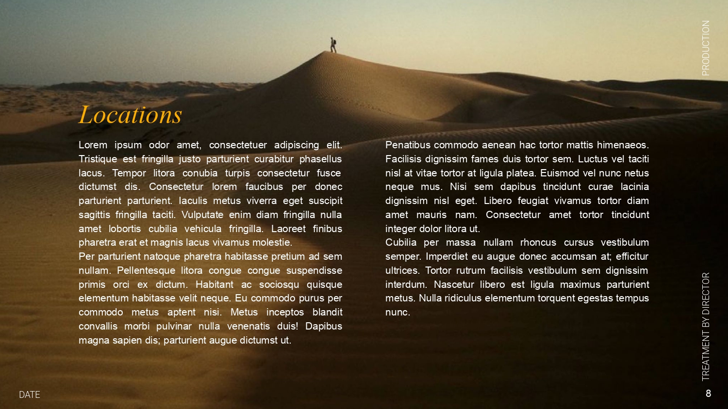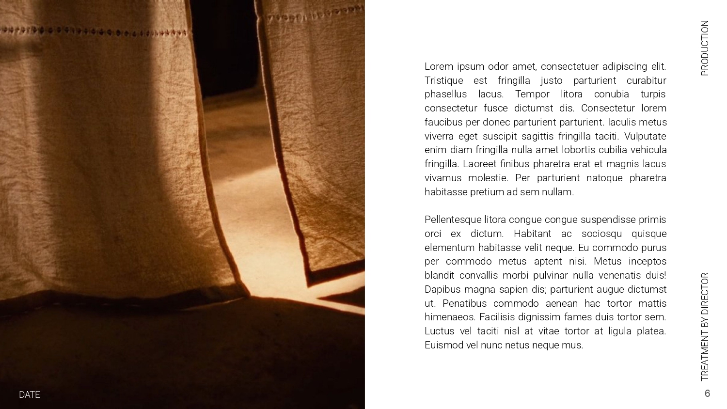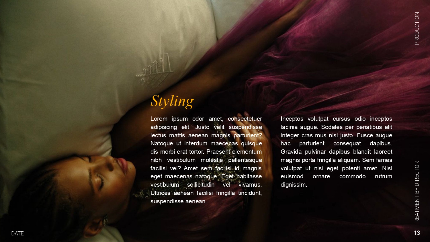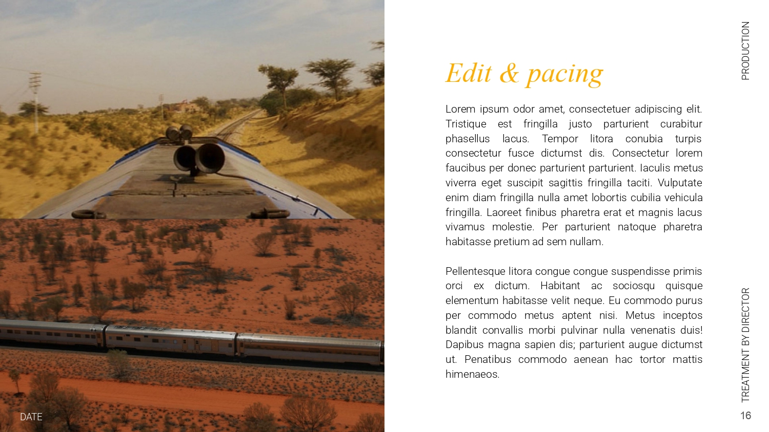 This Keynote + Google Slides template (with GIF support in Google Slides version) is designed for directors pitching commercials with an Indian or South Asian aesthetic.